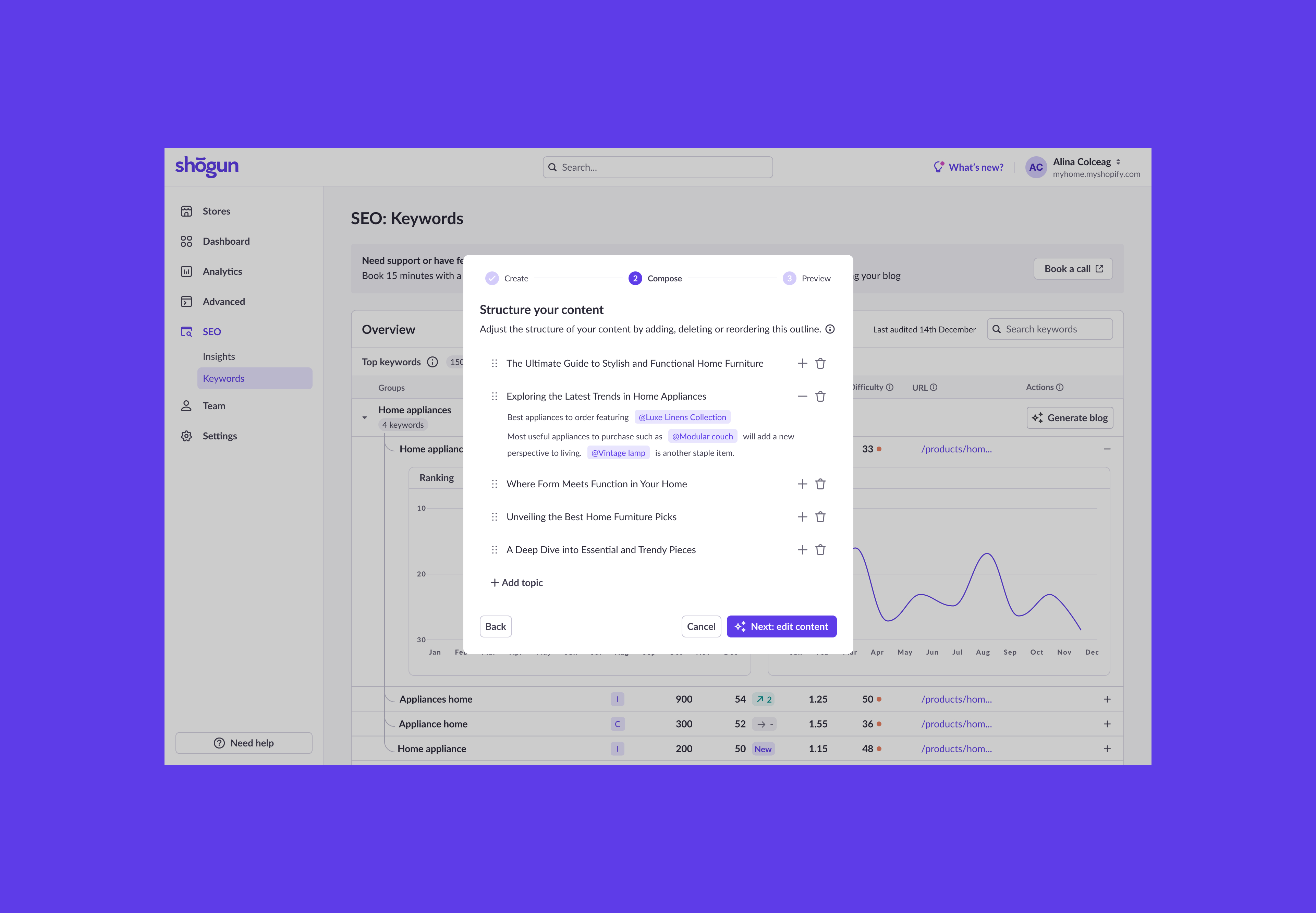 Through previous research, we uncovered that the usefulness of creating custom content relied in it being highly personalised to each specific use-case. As part of the next phase of the project, we incorporated the creation of custom blog content based on SEO recommendations to increase traffic, being well-positioned to fix some of the most difficult parts of SEO strategy: generating high-quality content to improve a store’s ranking.