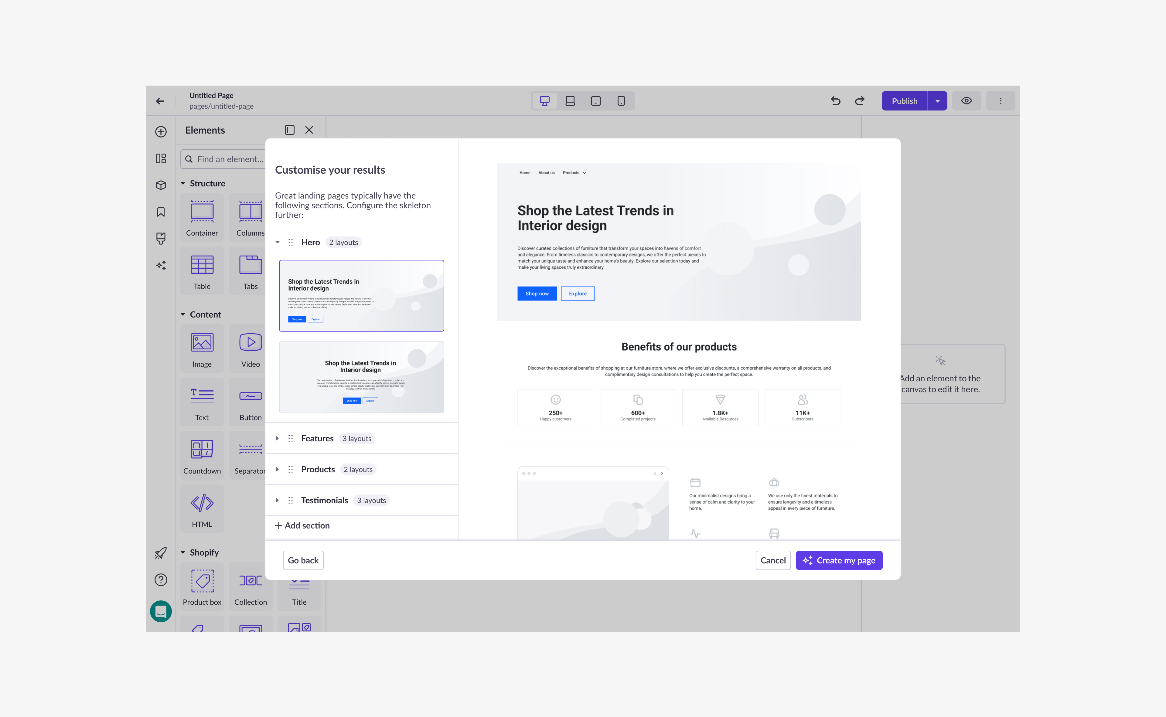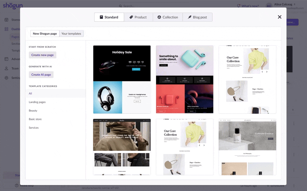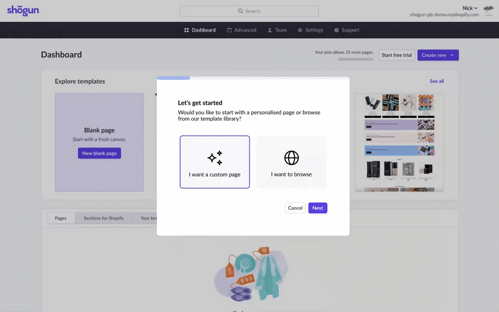 For creating a page, customers have the option to use a static template from the template library and modify it to their liking or create their page from a blank canvas. While both methods are great way to create a page, this is a time-consuming way to create one and it lacks all the custom context available based on the store's unique characteristics.