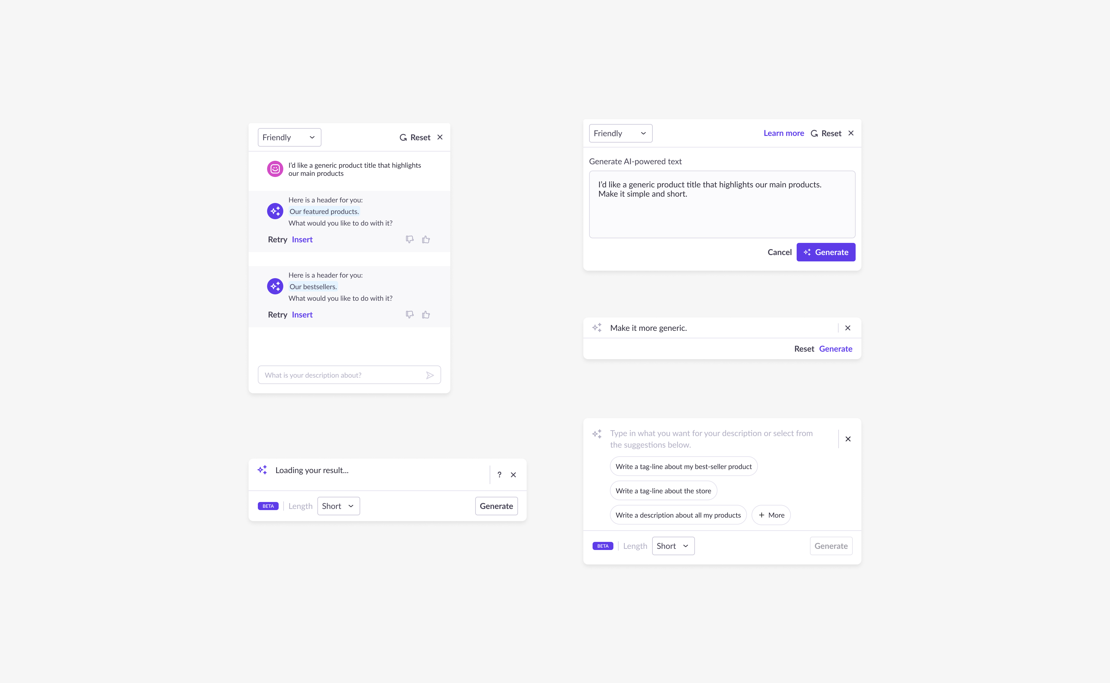 This is where integrating AI capabilities to generate pages proved useful, by offering customers pre-made pages based on a simple prompt combined with store context, taking the time-consuming work out of the process of building a page.
