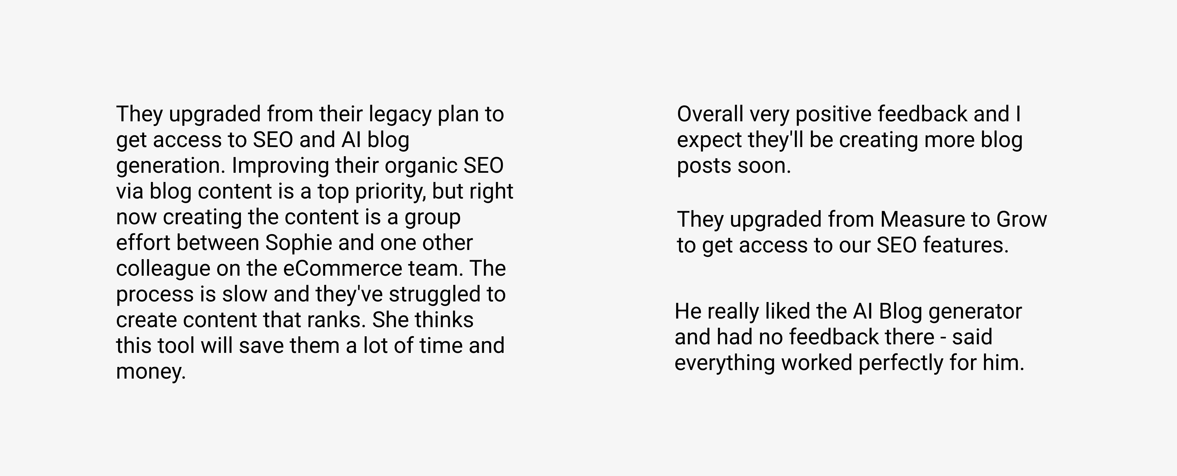 I set out to create a smoke test to validate the need for the feature. In collaboration with the product manager, we conducted discovery calls with the customers who signalled interest to better understand how they currently improve their SEO ranking. Through this, we were able to validate our hypothesis from the get-go: customers wanted help with the creation of quality content to improve their SEO ranking, either because they lacked the time or resources to focus on it.