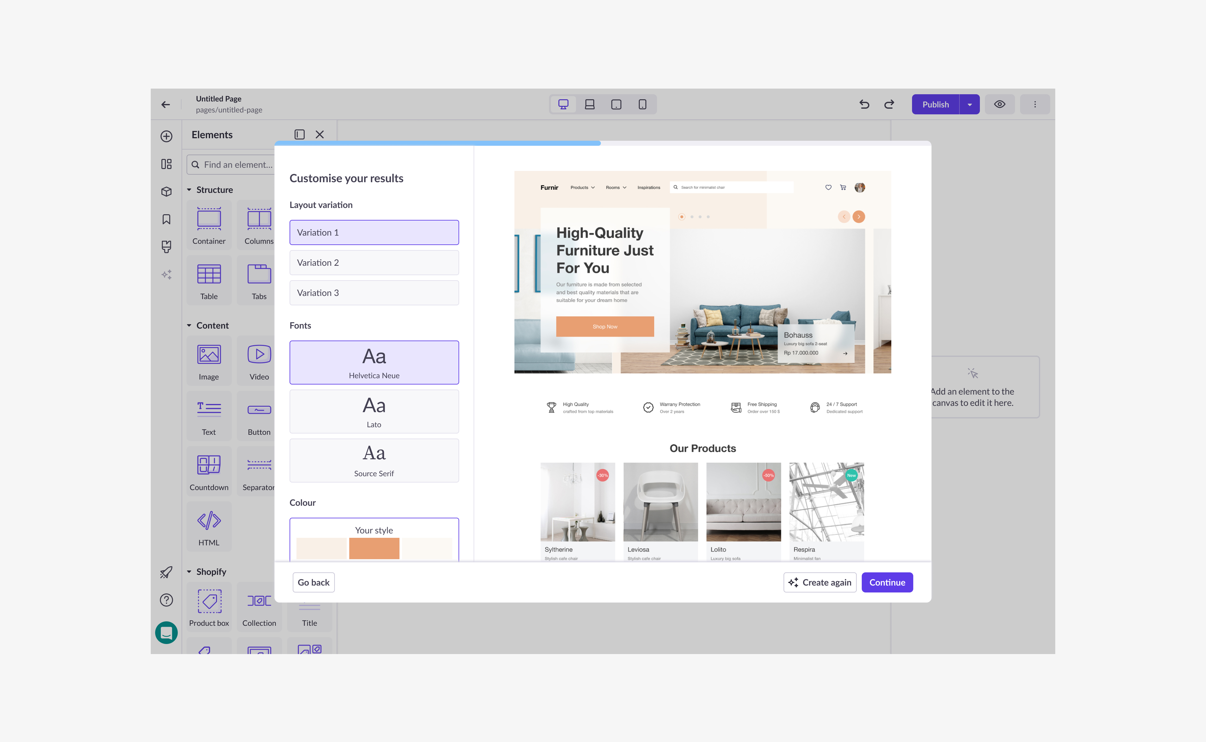 First step was to define the best approach for generating a specific page. I started out with a blue-sky exploration to envision how might we approach generating the page in an ideal world without any technical constraints or limitations. The exploration included the ability to generate custom layout and content based on a single prompt while having the ability to further customise layout variations or colour schemes in a wizard setting. This artefact sparked further conversations with engineering and product over what's feasible and realistic for our timelines.
