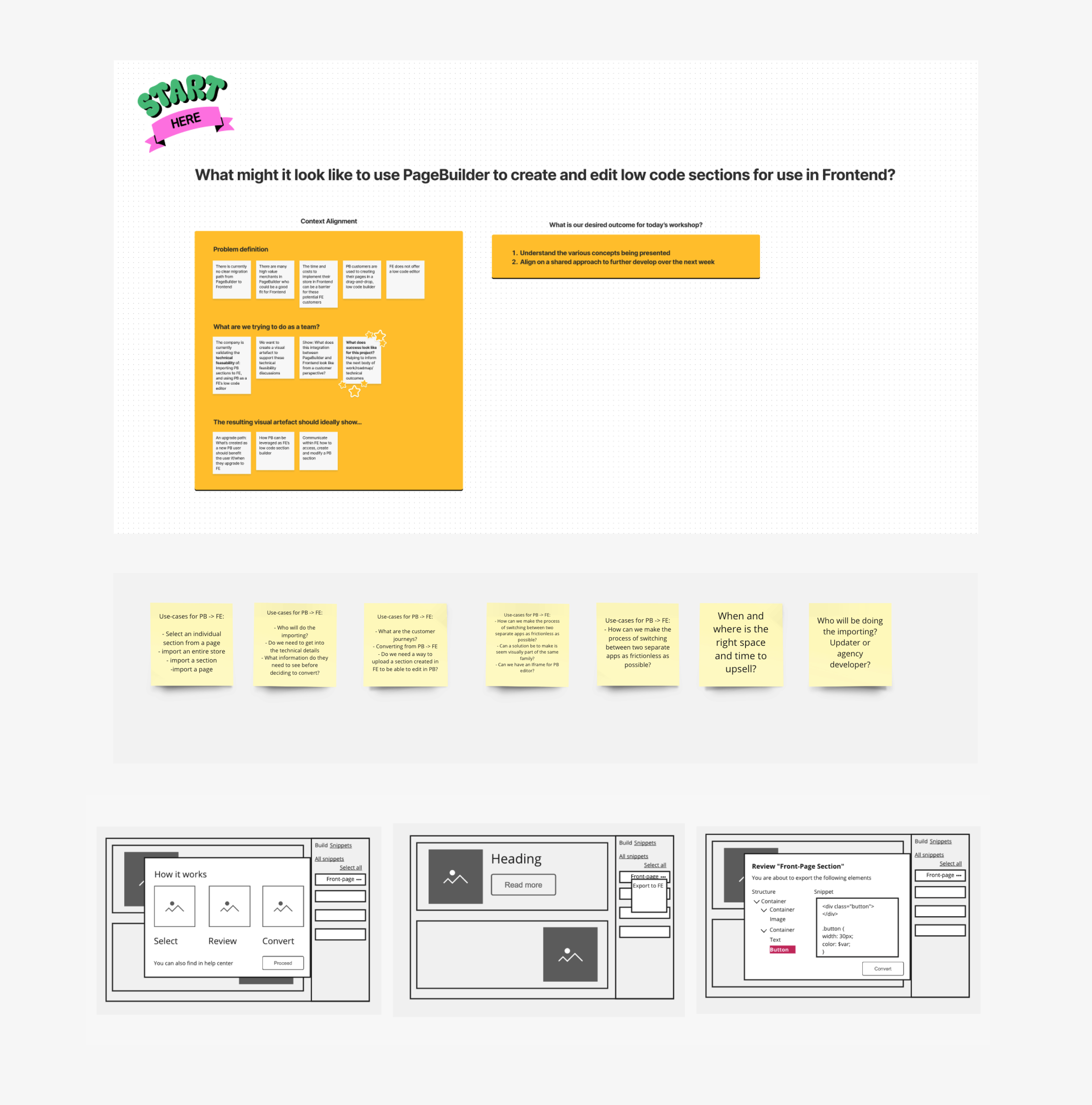 After the initial steps taken, I started off by putting together the flow for an ideal state of what it would mean to fully integrate Page Builder's no-code editor into the Frontend product and reverse engineer the milestones based on this artifact together with the engineering team to discuss feasiblity and realistic milestones. In an ideal world we wanted Page Builder's editor to be part of a seamless experience when you would create a section. That meant the ability to directly login to Frontend as a user and directly access Page Builder's no-code editor through the Frontend platform.